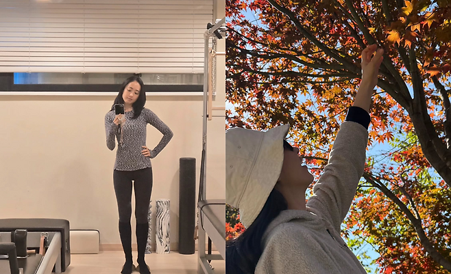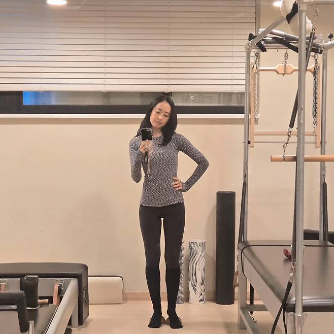 네 번째 사진에서는 필라테스 스튜디오에서의 운동복 패션을 선보였다. 몸에 딱 맞는 그레이 톤의 긴팔 상의와 블랙 레깅스를 매치해 실루엣을 강조했다. 여기에 무릎 위까지 오는 블랙 워머를 착용해 보온성과 스타일을 동시에 잡았다. 심플하면서도 세련된 운동복 코디가 돋보인다.
