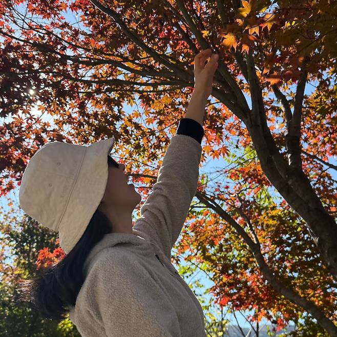 세 번째 사진에서는 가을 감성이 물씬 풍기는 아웃도어룩을 연출했다. 베이지색 후드 집업과 버킷햇으로 계절감을 살렸으며, 단풍나무 아래에서 자연스럽게 포즈를 취하며 따뜻한 분위기를 자아냈다. 편안하면서도 계절에 맞춘 센스 있는 코디가 눈길을 끈다.