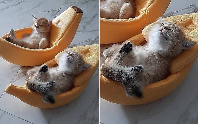 아기 고양이들에게 예쁜 바나나 침대를 사줬더니