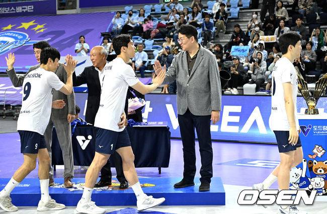 조원태 한국배구연맹 총재가 대한항공 선수들과 하이파이브를 나누고 있다. 2025.04.05 /sunday@osen.co.kr