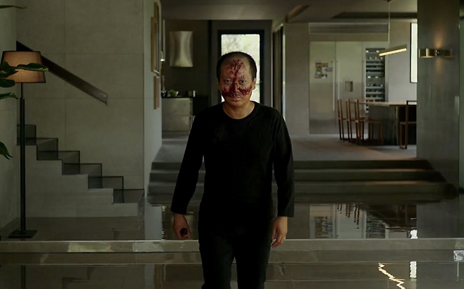 비 오는 밤 지하실에서 눈을 부릅 뜨고 나타나는 장면, 센서등 스위치를 이마로 쳐서 피를 흘리는 장면, 대낮에 칼을 들고 정원으로 걸어가는 장면은 모두 섬뜩했다.