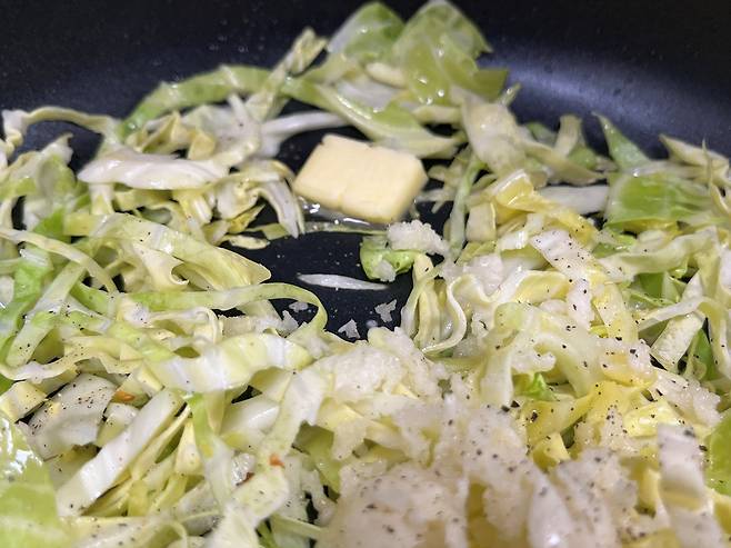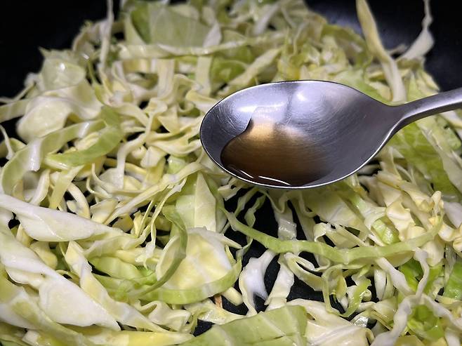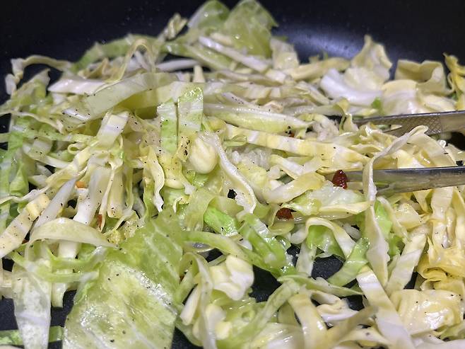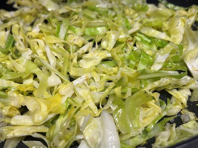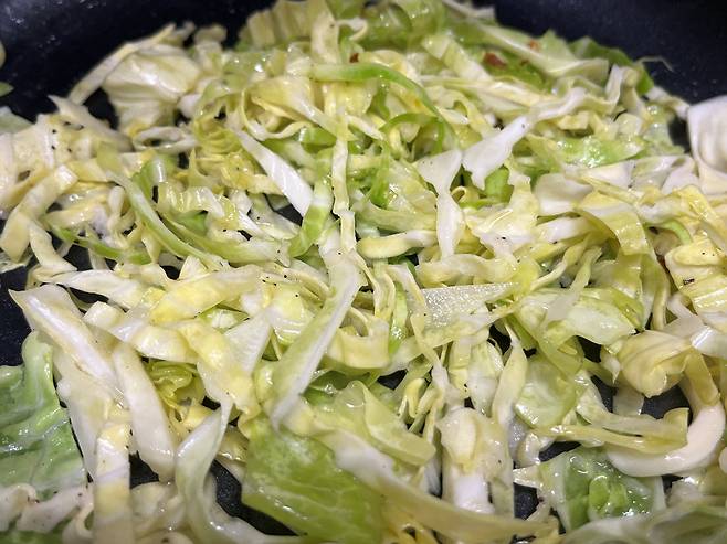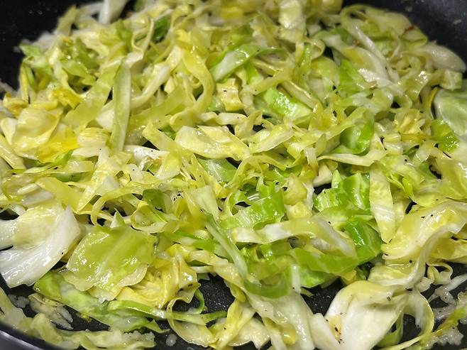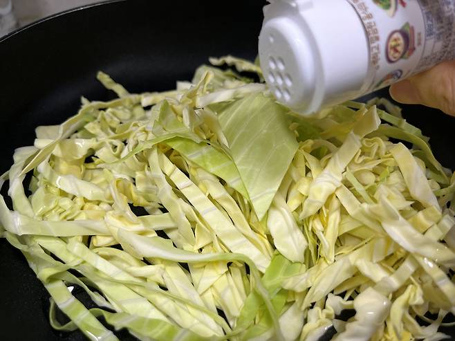 양배추는 얇게 자른 후 기름을 두른 팬에 넣고 약불로 볶으세요. 소금을 2~3꼬집 넣어 밑간을 합니다.