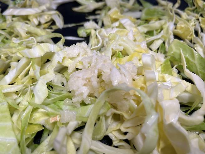 양배추가 투명해지기 시작하면 다진 마늘을 1스푼 넣고 달달 볶아 주세요. 마늘은 처음부터 넣으면 향이 다 날아가기 때문에 중간 과정에서 넣어 줍니다.