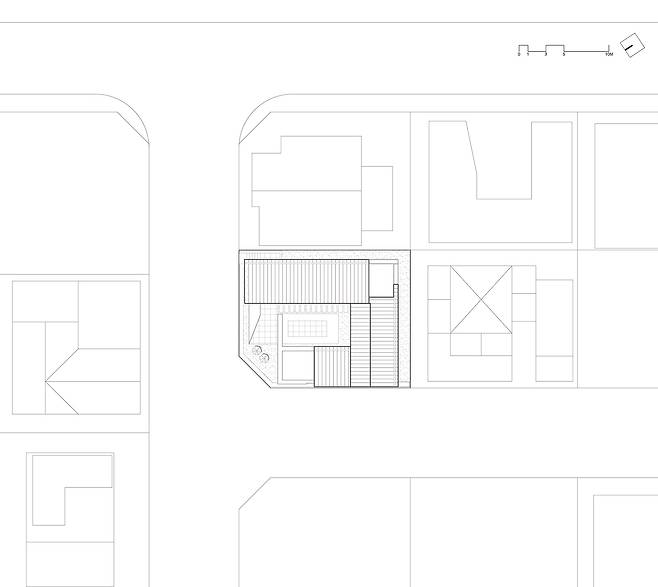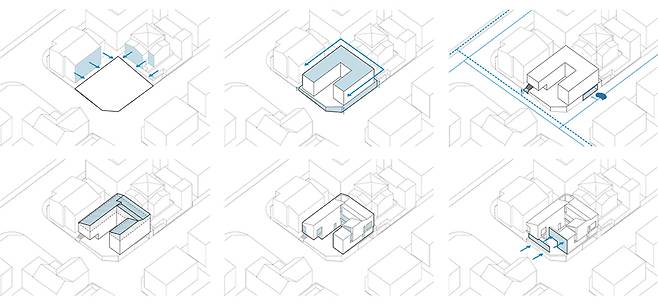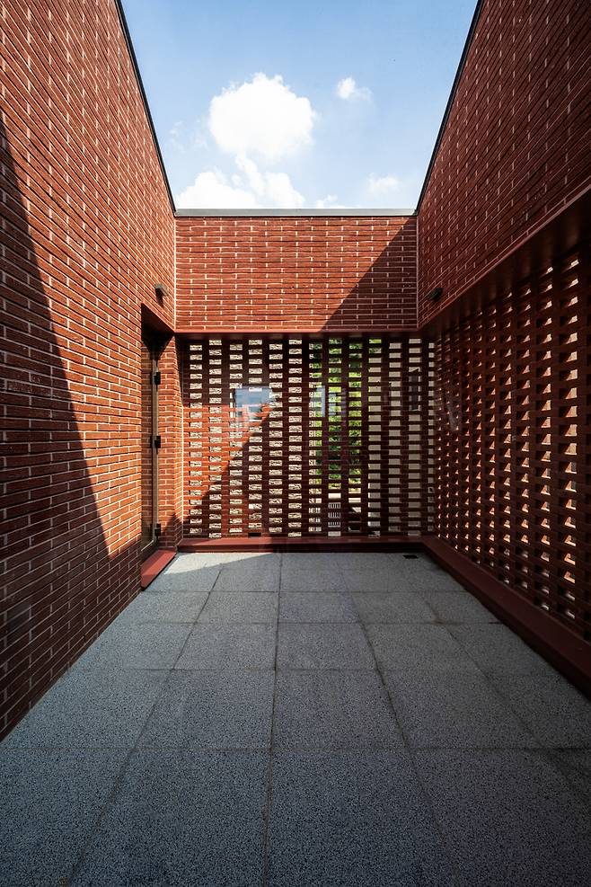 건물 중심에서 바라보았을 때, 윗담과 아랫담이 중첩되며 만들어내는 공간의 깊이감은 중정의 개방감을 극대화시켜 ㄷ자 배치의 답답함을 해소해준다. 처음부터 고민했던 이웃과의 프라이버시에 대한 ‘어떻게 닫아줄 것인가‘ 와 중정형 건물의 개방감 확보를 위한 ’어떻게 열어줄 것인가‘ 라는 2개의 질문을 모두 해결하는 최선의 건축적 해결책이다.