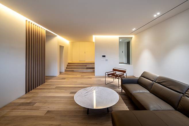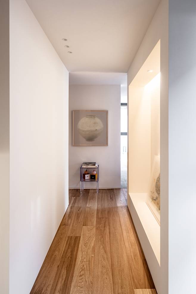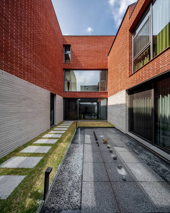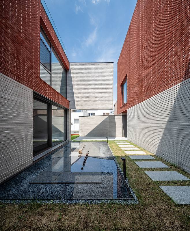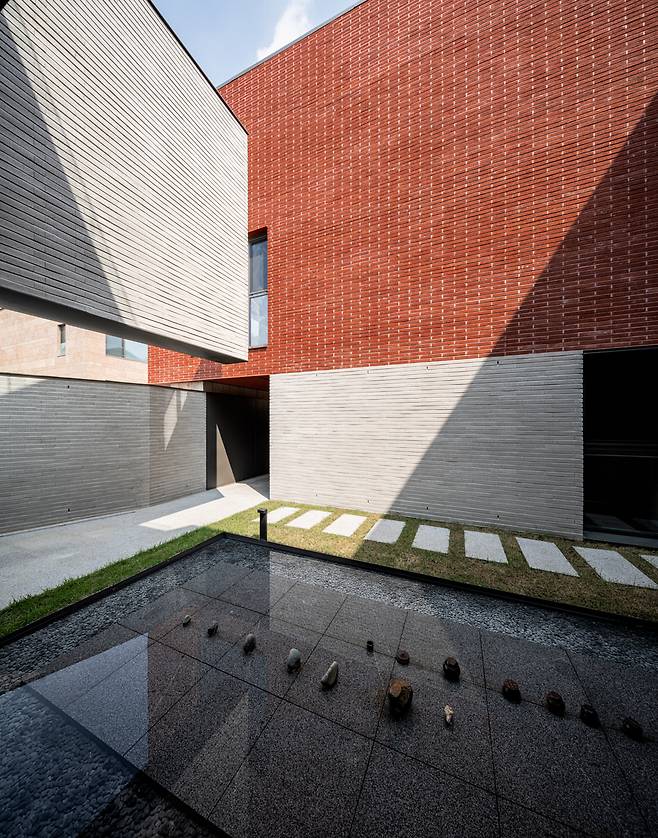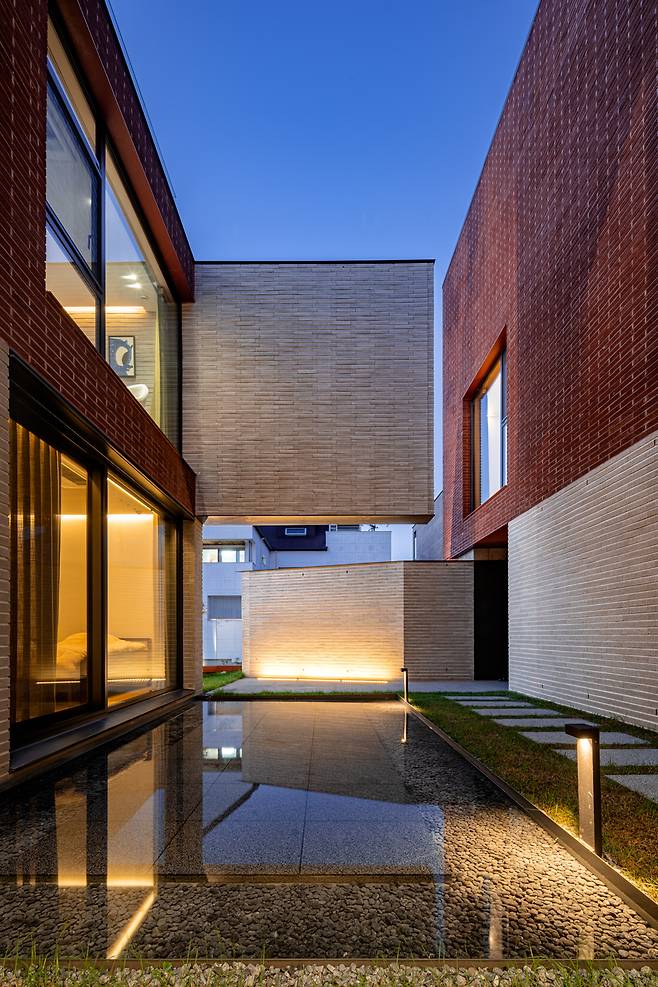 건물 중심에 위치해 실내에서 다양한 뷰로 조망 가능한 중정은 집의 분위기를 결정하는 메인 공간이었기에, 이 집이 가진 건축 언어와 비슷한 결을 부여해 공간의 통일성을 유지했다. 수공간은 이곳을 갤러리로도 사용하고 싶어 하는 건축주의 요구와 중정형 건물에서 최대한의 개방감을 찾고자 했던 고민에 대응하는 또 다른 건축적 제스처였다. 중정을 가득 채운 물은 주변 모습을 바닥에 비추며 색다른 개방감을 형성하고, 그 자체로 마치 하나의 예술 작품처럼 집 한 가운데에 고요히 자리 잡아 갤러리와 같은 공간감을 선사한다.