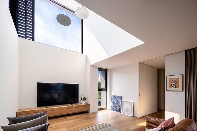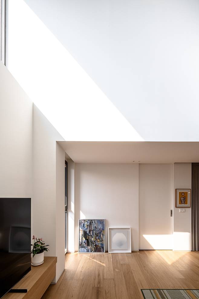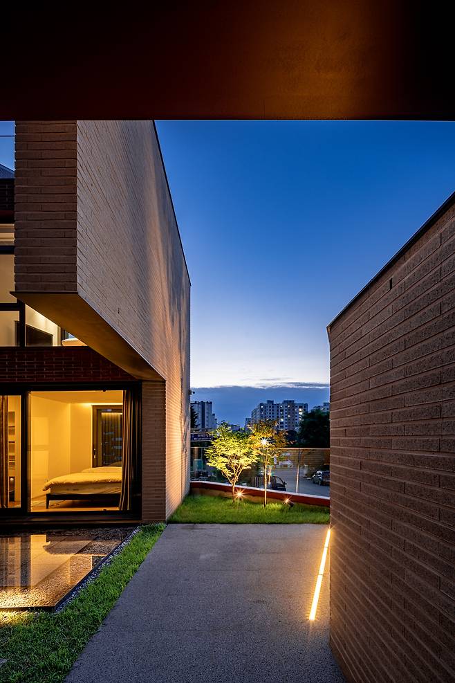 모든 시선이 내부에서 대지 바깥을 바라보는 아들의 공간은 한옥의 ‘사랑채’처럼 외부를 향해 적극적으로 열려있고, 보다 안쪽에 위치한 딸의 공간은 한옥의 ‘안채’와 같이 내향적 구조를 가진다. 두 자녀 모두 자신의 공간에서 즐길 수 있는 자연 풍경을 제공하는 동시에 서로 다른 방향성을 부여함으로써 시선의 간섭을 완벽하게 차단해 프라이버시 문제를 해결하였다.