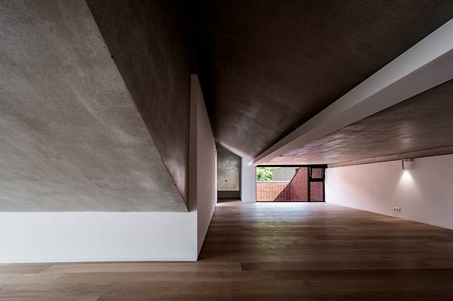 조경 요소와 어우러진 수공간은 중정에 갤러리의 성격을 부여하는 동시에 색다른 개방감을 형성하고, ㄷ자 배치로 길어진 동선은 내부 벽을 갤러리월로 치환하기 위한 선택이다.지하층부터 1, 2층과 다락으로 구성된 내부는 부모와 자녀 공간의 독립성을 충족하는 데 집중했다.