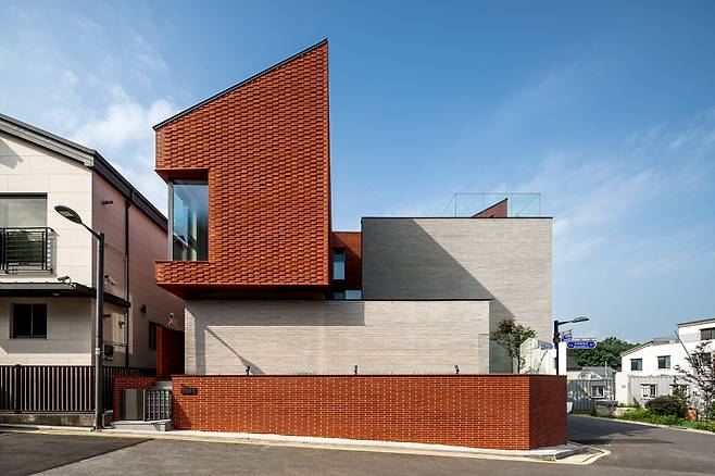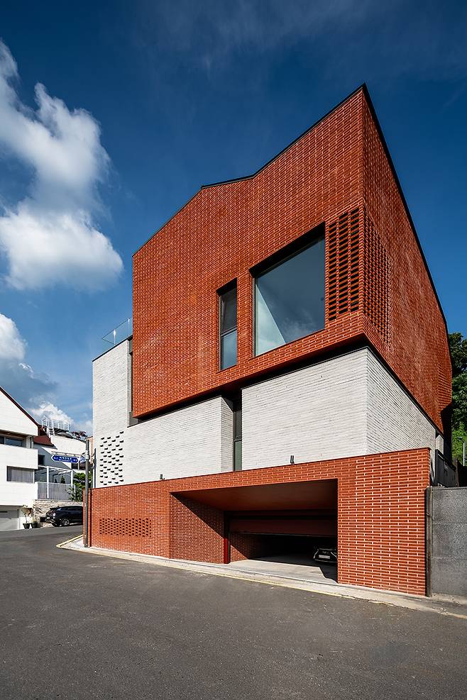 단독주택의 스케일감을 유지하기 위해서는 건물이 거대한 한 덩어리가 아닌 분절된 덩어리‘들’로 느껴져야 했다. 그러나 실제로 형태를 분절시키긴 어려워 입면 디자인을 통해 건물의 스케일감을 세밀하게 조정하였다. 지하 1층과 지상 2층은 빨간 벽돌을, 그 사이의 지상 1층은 회색 벽돌을 사용하는 방식으로 재료의 분리를 통해 1차적으로 공간의 개별감을 강조하였다. 겨우 재료 선택을 달리 했을 뿐이지만 차이는 확연하다. 2층과 다락은 돌출된 동시에 1층 벽으로부터 살짝 떨어져 있어 단순한 분리를 넘어 마치 떠 있는 듯하다. 이로 인해 보행자는 건물을 3층 높이의 덩어리로 인식하지 않고 1~2층 규모로 인식하게 된다.
