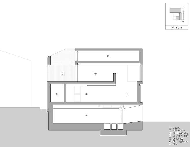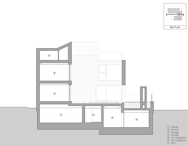 도로와 마주한 면들도 그 너머에 이미 집이 들어섰거나 신축될 예정이었으므로 사방이 막힌 상황이나 마찬가지. 게다가 대지의 숨을 터줄 수 있는 커다란 녹지도 인접 대지의 주택에 가려 보이지 않았다. 이런 환경은 건축주뿐 아니라 이웃 주민의 프라이버시에 대한 대응은 물론, 닫힌 대지에 개방감을 확보해줄 해답을 요했고, 이 외에도 ‘프라이버시 보호’, ‘자연적인 휴식 공간’, ‘갤러리로도 활용 가능한 공간’이라는 건축주의 요청도 고려해야 했다. 계획은 평지에 가까운 전면 도로와 약 2m의 높이 차로 경사가 존재하는 우측 도로를 활용하여 차량 진입과 도보 진입의 동선을 분리하는 데서 시작했다.
