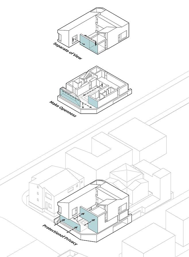 “주거 공간을 어떻게 열어주고, 어떻게 닫아줄 것인가?” 이 대지에서 우리가 마주한 제일 중요하고도 어려운 질문이었다. 마치 감시 카메라처럼 사방에 도사린 주변 시야를 피해 프라이버시를 보호하기 위해서는 결국 중정을 둘러싼 형태가 최선의 선택이었다. 이 때문에 내·외부의 프라이버시 문제를 모두 해결하면서도 중정형 주택이 가진 폐쇄성이라는 한계를 극복해야 하는 과제가 주어졌다.