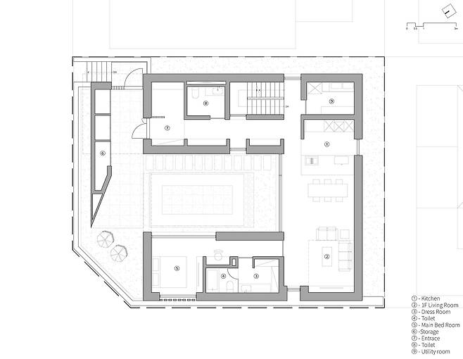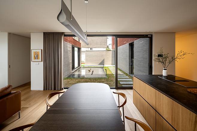 건물 중심에 위치해 실내에서 다양한 뷰로 조망 가능한 중정은 집의 분위기를 결정하는 메인 공간이었기에, 이 집이 가진 건축 언어와 비슷한 결을 부여해 공간의 통일성을 유지했다. 수공간은 이곳을 갤러리로도 사용하고 싶어 하는 건축주의 요구와 중정형 건물에서 최대한의 개방감을 찾고자 했던 고민에 대응하는 또 다른 건축적 제스처였다. 중정을 가득 채운 물은 주변 모습을 바닥에 비추며 색다른 개방감을 형성하고, 그 자체로 마치 하나의 예술 작품처럼 집 한 가운데에 고요히 자리 잡아 갤러리와 같은 공간감을 선사한다.