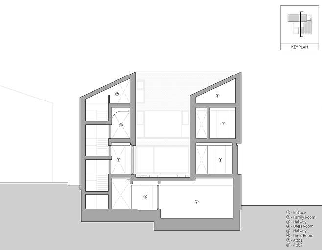 우리는 사방이 건물로 막힌 닫힌 대지의 맥락을 해석하고 건축주의 요구를 충족시키는 집을 만들고자 하였다. 담장(Wall)은 건축주의 사생활을 보호하면서도 주변을 압도하지 않도록 배려한 건축 언어였다. 벽 너머 도시 맥락 속에서는 이웃의 프라이버시 보호를 위한 장치로, 벽 안의 건축적 스케일 속에서는 두 자녀의 프라이버시 보호와 공간의 깊이감을 만들어내는 장치로 작동하는 담장. 결국 담장은 우리가 만든 건축적인 기준이자, 벽 너머에 존재하는 서로 다른 단위 맥락에서 각각의 요구를 읽고 그에 대응하는 건축적 제스처인 것이다.