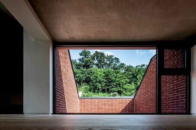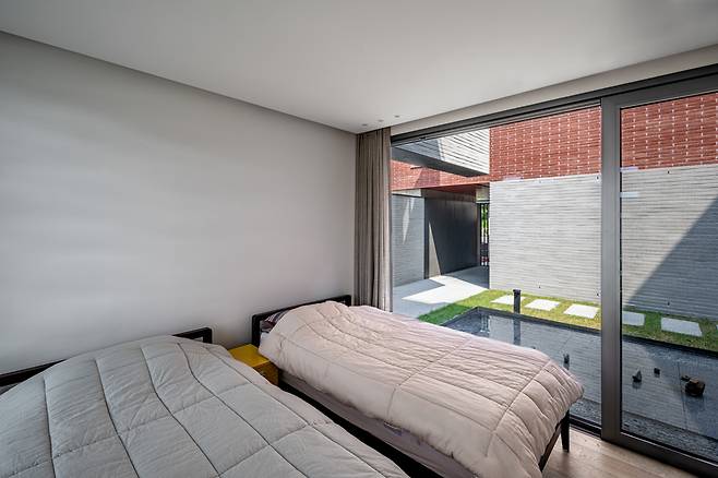 모든 시선이 내부에서 대지 바깥을 바라보는 아들의 공간은 한옥의 ‘사랑채’처럼 외부를 향해 적극적으로 열려있고, 보다 안쪽에 위치한 딸의 공간은 한옥의 ‘안채’와 같이 내향적 구조를 가진다. 두 자녀 모두 자신의 공간에서 즐길 수 있는 자연 풍경을 제공하는 동시에 서로 다른 방향성을 부여함으로써 시선의 간섭을 완벽하게 차단해 프라이버시 문제를 해결하였다.