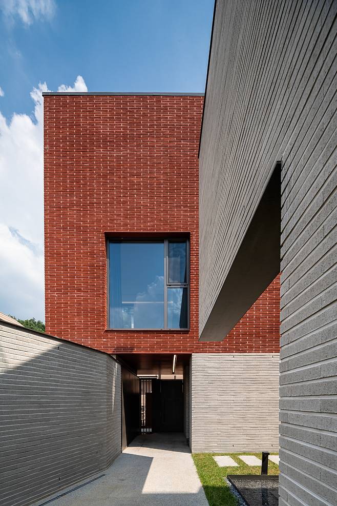 단독주택의 스케일감을 유지하기 위해서는 건물이 거대한 한 덩어리가 아닌 분절된 덩어리‘들’로 느껴져야 했다. 그러나 실제로 형태를 분절시키긴 어려워 입면 디자인을 통해 건물의 스케일감을 세밀하게 조정하였다. 지하 1층과 지상 2층은 빨간 벽돌을, 그 사이의 지상 1층은 회색 벽돌을 사용하는 방식으로 재료의 분리를 통해 1차적으로 공간의 개별감을 강조하였다. 겨우 재료 선택을 달리 했을 뿐이지만 차이는 확연하다. 2층과 다락은 돌출된 동시에 1층 벽으로부터 살짝 떨어져 있어 단순한 분리를 넘어 마치 떠 있는 듯하다. 이로 인해 보행자는 건물을 3층 높이의 덩어리로 인식하지 않고 1~2층 규모로 인식하게 된다.