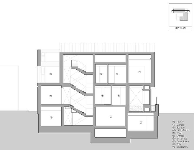 도로와 마주한 면들도 그 너머에 이미 집이 들어섰거나 신축될 예정이었으므로 사방이 막힌 상황이나 마찬가지. 게다가 대지의 숨을 터줄 수 있는 커다란 녹지도 인접 대지의 주택에 가려 보이지 않았다. 이런 환경은 건축주뿐 아니라 이웃 주민의 프라이버시에 대한 대응은 물론, 닫힌 대지에 개방감을 확보해줄 해답을 요했고, 이 외에도 ‘프라이버시 보호’, ‘자연적인 휴식 공간’, ‘갤러리로도 활용 가능한 공간’이라는 건축주의 요청도 고려해야 했다. 계획은 평지에 가까운 전면 도로와 약 2m의 높이 차로 경사가 존재하는 우측 도로를 활용하여 차량 진입과 도보 진입의 동선을 분리하는 데서 시작했다.