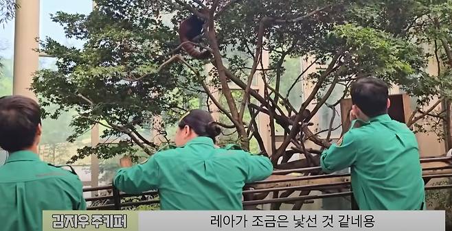 이때 놀랍게도 레아를 위해 많은 주키퍼들이 나섰습니다. 바로 레아를 응원하기 위해서였는데요. 아직까지 많은 사람들 앞에 서본 적이 없는 레아를 위해 적응할 수 있도록 많은 인파에 노출시킨 것입니다. 그러나 아직까지는 많이 낯선 듯 레아는 조심스러운 눈빛으로 나무 위에서 주키퍼들을 바라보았습니다.