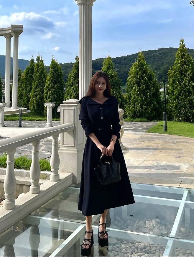 푸른 산과 사이프러스가 둘러싼 야외 정원, 네오클래식 컬럼과 유리 데크가 어우러진 무대 위에서 큐리가 담백한 블랙 룩을 선보였다. 햇살이 번지는 오후, 광택을 줄인 블랙 텍스처가 배경의 화이트 스톤·필라와 대비를 이루며 사진 한 장만으로도 ‘조용한 사치(Quiet Luxury)’ 무드를 각인시킨다. 미디 기장 원피스, 플랫폼 스트랩 샌들, 크로크 엠보 미니 토트의 삼박자가 단정하고도 세련된 실루엣을 그리며, 미니멀 취향과 하객룩·데이트룩 키워드까지 자연스럽게 소환한다.