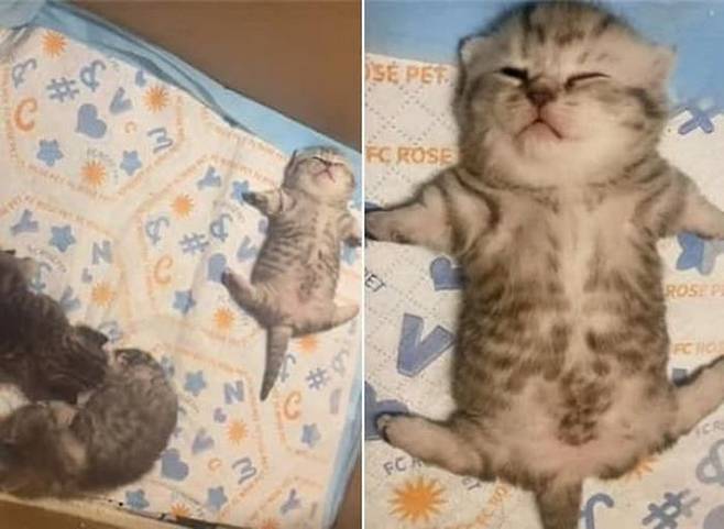 무방비 상태로 핑크빛 배를 드러낸 채 곤히 잠든 아기 고양이의 모습은 보는 이들의 심장을 부여잡게 만듭니다. 아빠는 이 모습이 혼자 보기 아까웠는지, 평소 무뚝뚝했던 모습은 버려둔 채 서툰 솜씨로 사진을 찍어 "고양이가 원래 이렇게 자는 거냐? 너무 귀엽다"라는 메시지와 함께 가족들에게 전송했습니다.