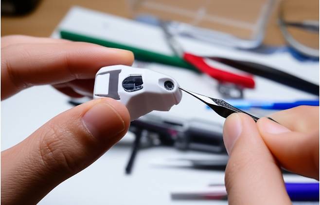 2. 게이트 자국 다듬기: 아트 나이프와 사포를 사용하여 게이트 자국을 깔끔하게 다듬습니다. 아트 나이프로 튀어나온 부분을 제거하고, 사포로 표면을 매끄럽게 만듭니다.