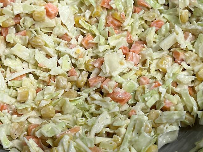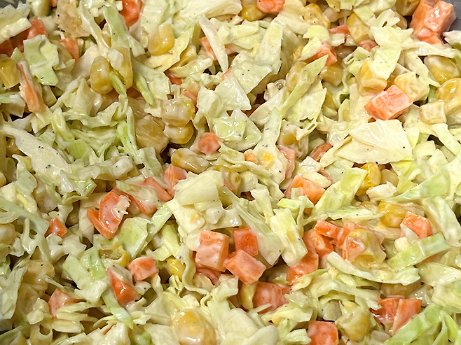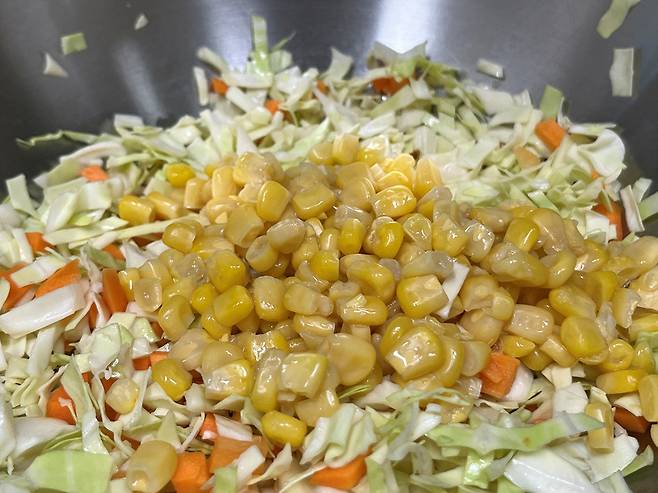 옥수수 통조림을 약 3스푼 넣어 줍니다. 옥수수가 들어가면 단맛이 가미되고 탱글한 식감이 더해져 양배추와 잘 어우러집니다.
