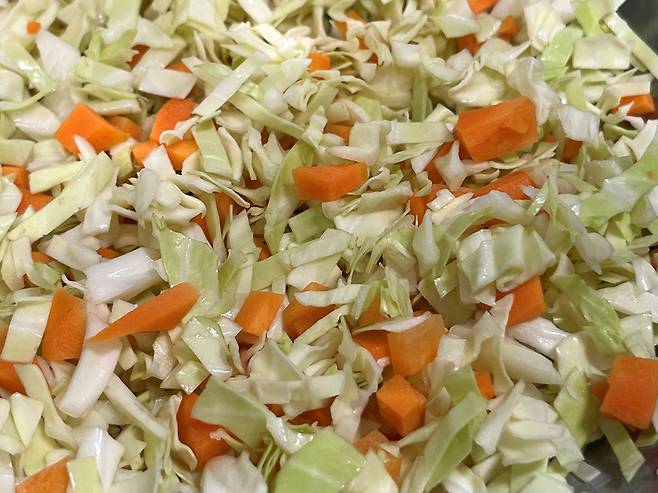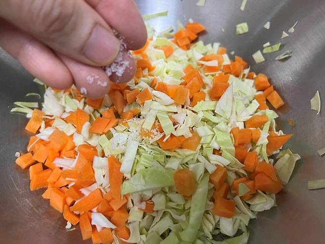 양배추와 당근은 잘게 썰어서 소금에 절입니다. 이 과정을 거치면 야채의 수분을 빼고 식감을 아삭하게 만들 수 있으며 냉장고에 보관해도 물이 덜 생깁니다. 소금 살짝 절여 약 15분 두세요.
