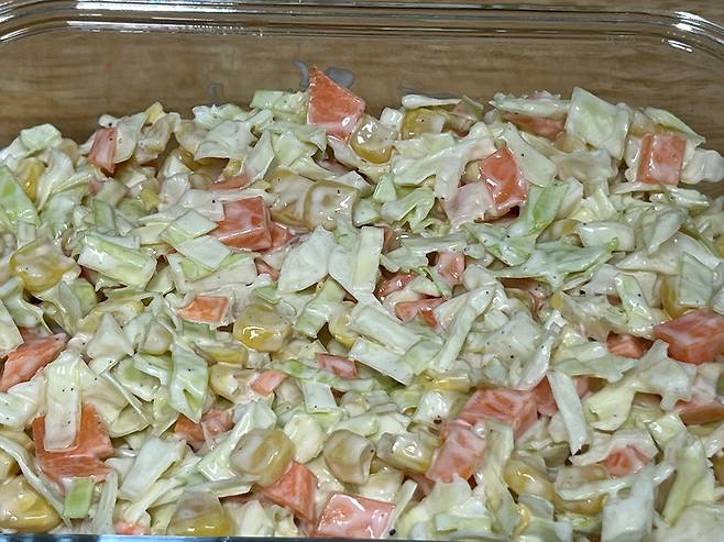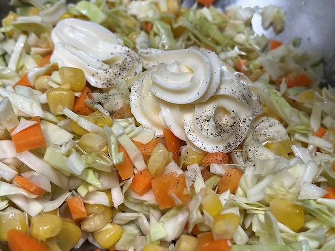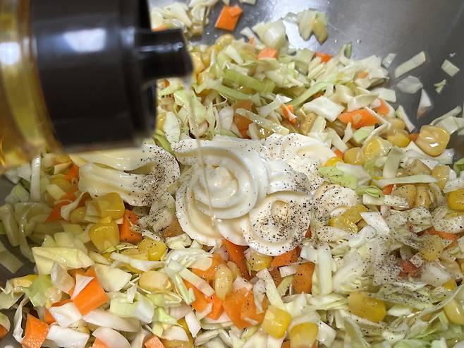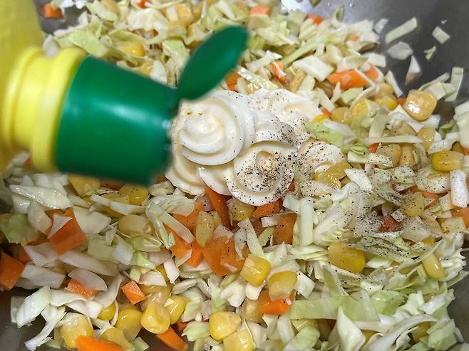 마요네즈는 약 4~5 스푼 듬뿍 넣어 주세요. 후추를 넣으면 느끼함을 잡을 수 있습니다. 만일 양배추가 너무 싱겁다면 소금으로 간을 추가해 주세요.