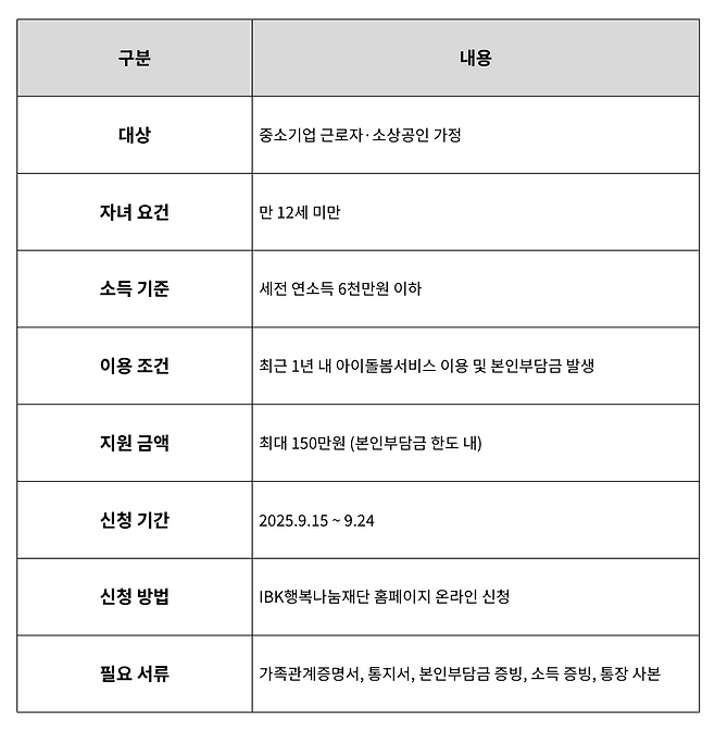 IBK기업은행과 IBK행복나눔재단은 이러한 부담을 줄이기 위해 ‘아이돌봄 지원사업’을 통해 최대 150만원까지 지원을 제공합니다.
