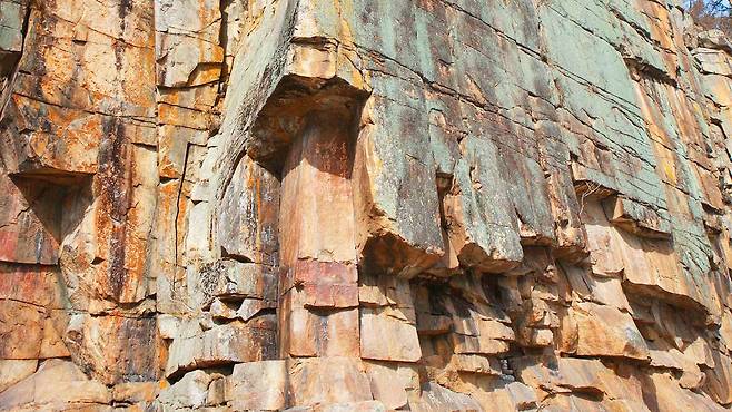 특히 판상절리와 수직절리가 교차하는 구조는 이곳의 가장 큰 특징이다. 암석이 일정한 방향으로 갈라지며 형성된 절리는 마치 인위적으로 쌓아 올린 듯한 독특한 형태를 만든다.