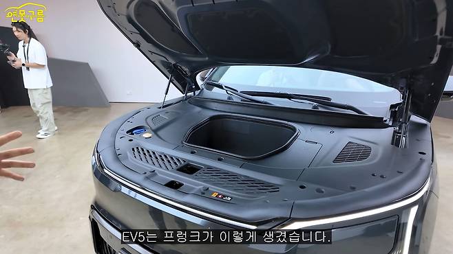 전기차의 큰 장점 중 하나는 바로 프렁크 공간이 제공된다는 점입니다. EV5 역시 약 44리터 용량의 프렁크 공간을 갖추고 있습니다. 생각보다 넓은 크기에 놀랐고, 마감 역시 매우 완성도 높게 처리되어 만족스럽습니다. 예전에는 꼬챙이 방식이었던 지지대가 이제는 양쪽에 가스 쇼바 방식으로 바뀌어 더욱 편리해졌죠.