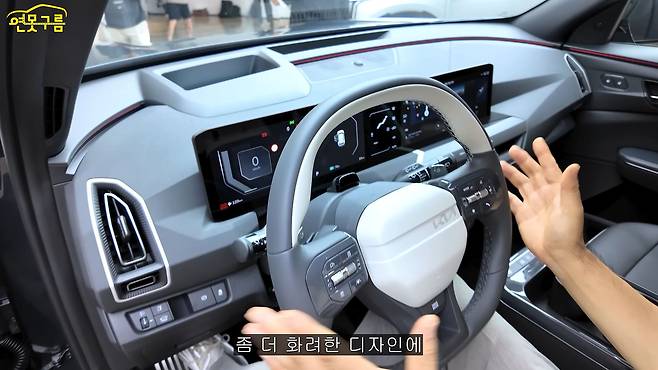 EV5의 실내 공간을 자세히 살펴보겠습니다. 먼저 스티어링 휠을 보면, GT-line은 일반 핸들보다 훨씬 화려한 디자인을 자랑합니다. 특히 투톤 컬러 조합 덕분에 확실히 고급스럽고 세련된 느낌을 받을 수 있습니다. 인테리어 컬러는 총 네 가지로 제공됩니다.