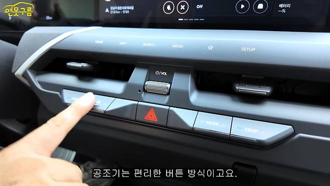 공조기는 사용자에게 익숙하고 편리한 버튼 방식을 채택했습니다. EV9부터 공통적으로 적용되고 있는 디자인이죠. EV3와 EV4에서는 이 부분이 플라스틱과 금속 재질이었는데, EV5는 상위 모델답게 플라스틱이 아닌 다른 소재를 사용했습니다. 이런 디테일에 신경을 쓴 모습이 엿보입니다.