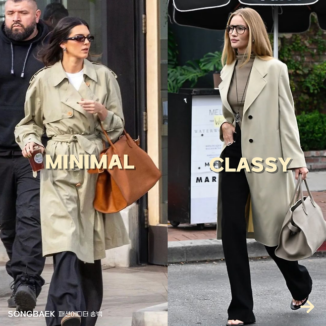 티셔츠, 트렌치코트, 와이드 팬츠 같은