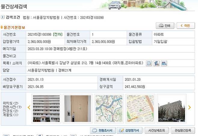 아래는 강남구 아파트로 검색하니 나온 리스트 중 은마아파트 경매 건입니다. 간략하게 풀이하면, 감정가가 얼마, 최저매각가격, 그리고 물건 사진은 물론 해당 지도를 통해 주변 호재가 있는지 정도를 분석해볼 수 있어요.
