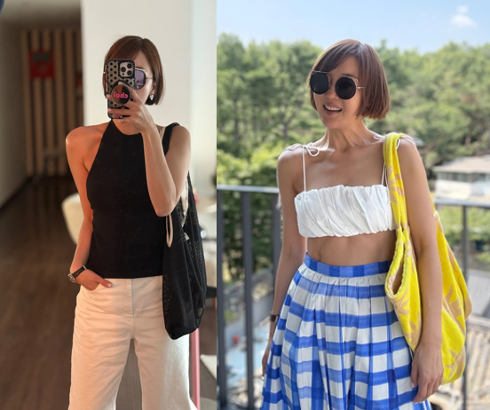 블랙 슬리브리스에 화이트 팬츠로 깔끔하게 연출한 모노톤 룩부터, 풍성한 실루엣의 롱 원피스, 발랄한 체크 스커트에 크롭탑까지 스타일리시한 50대의 일상룩을 보여주며 감탄을 자아냈다.