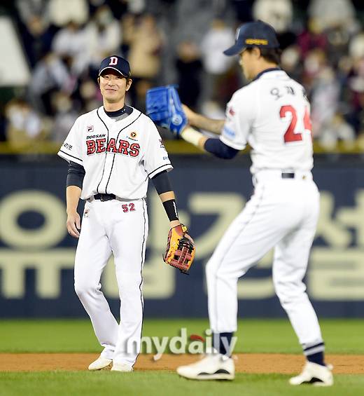 이날 경기서 오재원은 8회말 2사 후 대타로 마지막 타석을 마쳤고, 9회초 2루수로 마지막 수비를 했다. 그리고 김태형 감독은 김재호를 유격수로 교체 투입했다. 오재원의 '영혼의 파트너'이자 두산 왕조를 이끌었던 키스톤 콤비가 오랜만에 함께 잠실 그라운드를 밟은 것이다. 오재원은 오랜만의 경기라 긴장한 표정이 역력했고, 그런 모습을 옆에서 지켜보던 김재호의 미소에는 많은 의미가 담겨있었다.