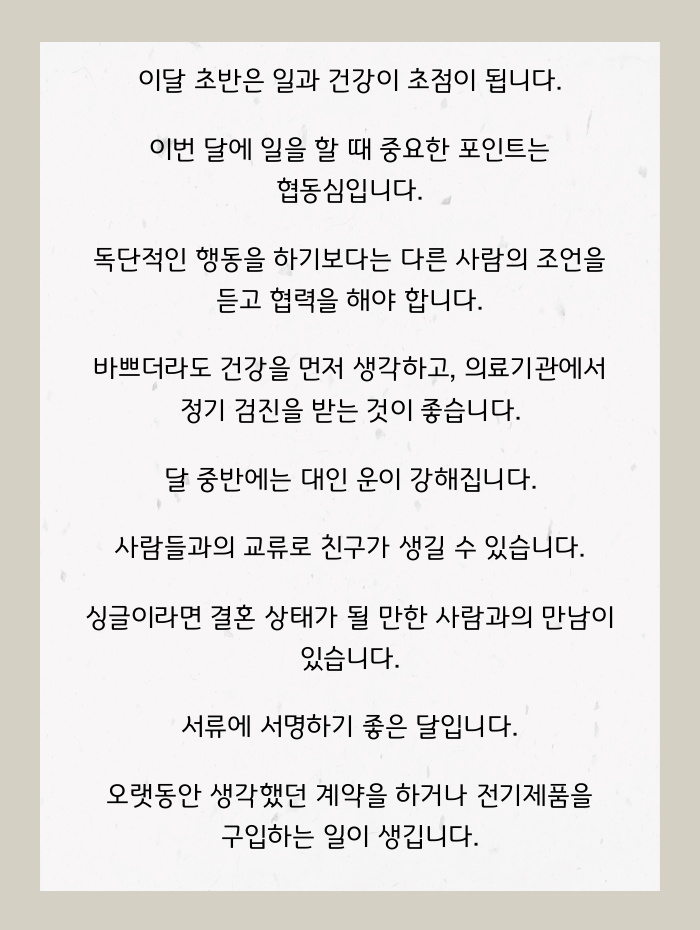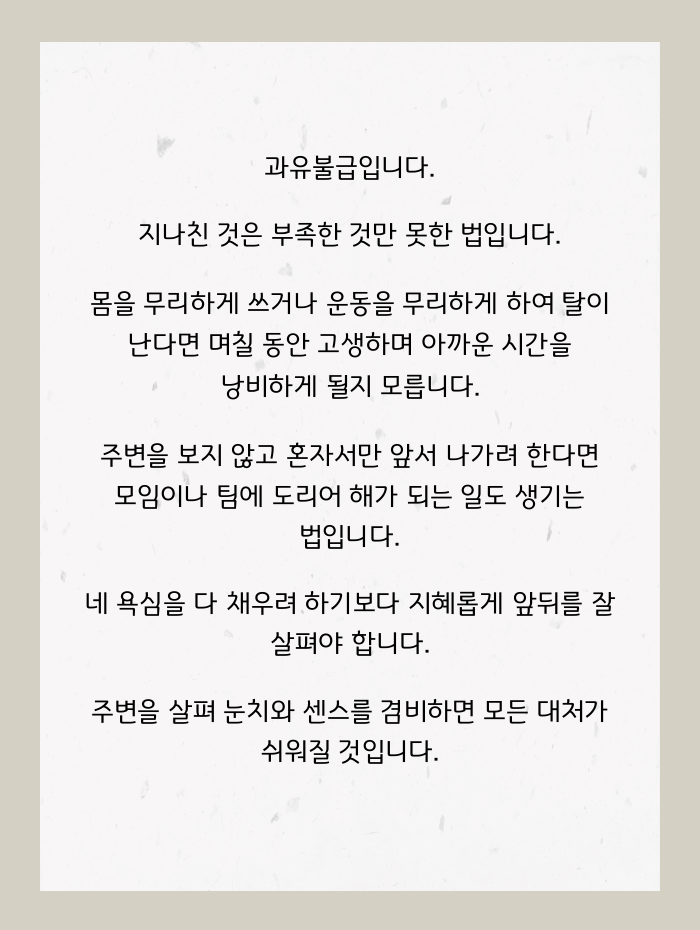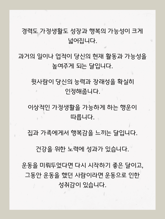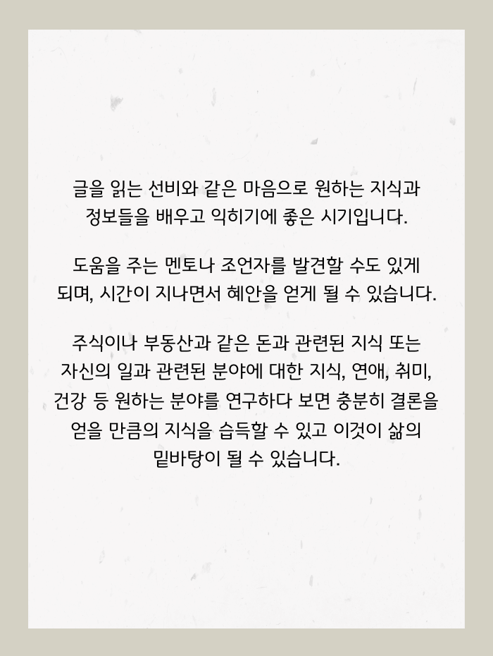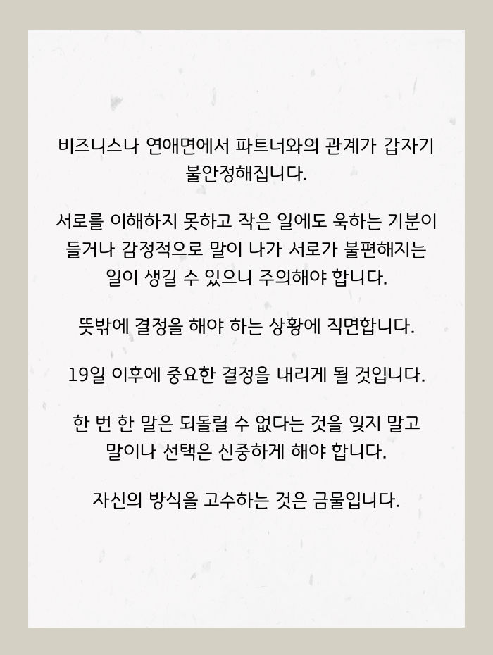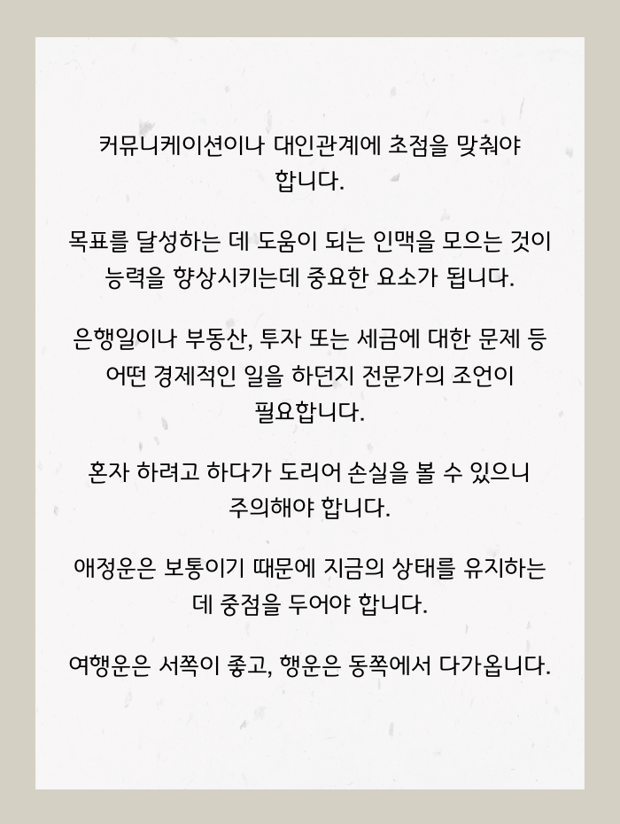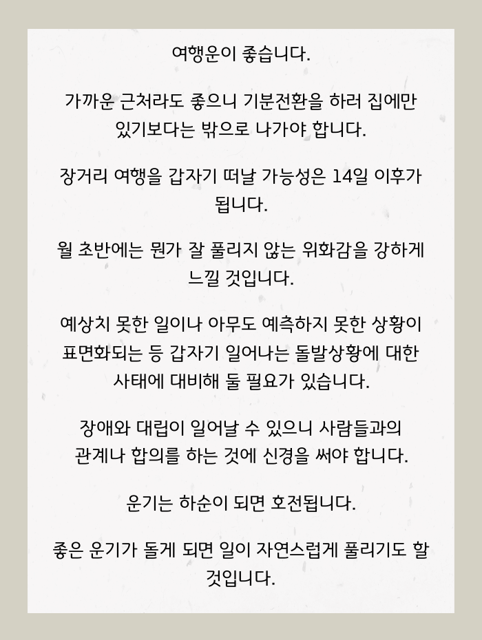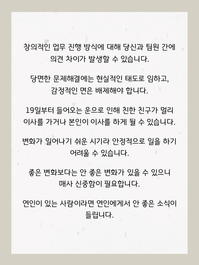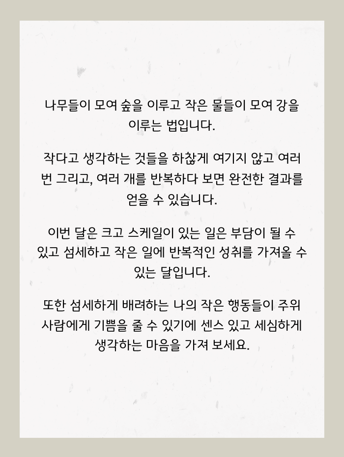 아직 마무리되지 않은 일이 있다면 차분히 정리하고, 내려놔야 할 마음의 짐이 있다면 부드럽게 놓아주는 지혜가 필요한 때입니다.