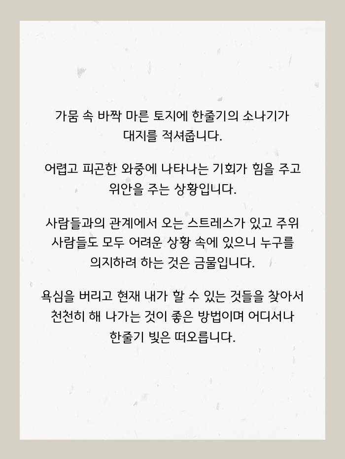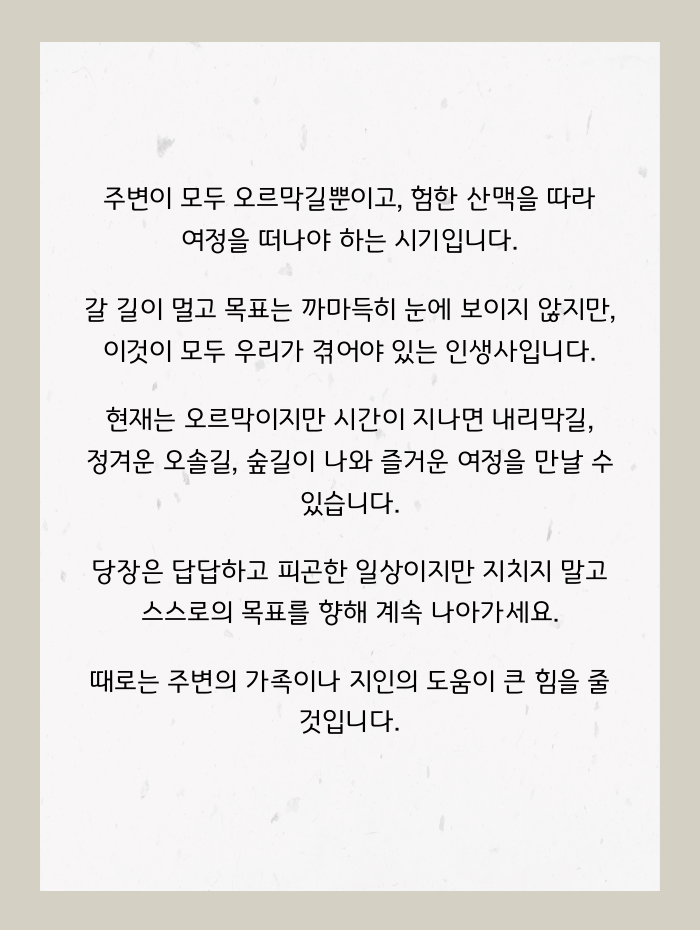 올해 흘린 땀과 눈물, 기쁨과 성장을 조용히 다독이며 스스로에게 작은 박수를 보내보세요.