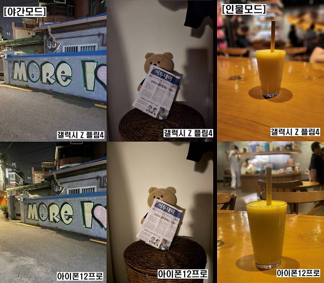 갤Z 플립4가 의외로 야간모드에서 준수한 결과를 보였고 아이폰12프로는 다소 노란끼가 돌았다. 인물모드에서는 갤Z 플립4가 더 선명한 결과물을 보였다. 다만 아이폰12프로가 조금 더 자연스러운 느낌을 준다.