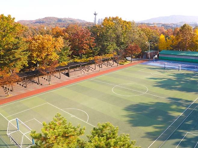 유한킴벌리는 학교 담장을 허물고 숲을 만들기 시작했어요. 산의 능선처럼 제각기 높이 다른 나무들이 편안하게 학교를 감쌌습니다.