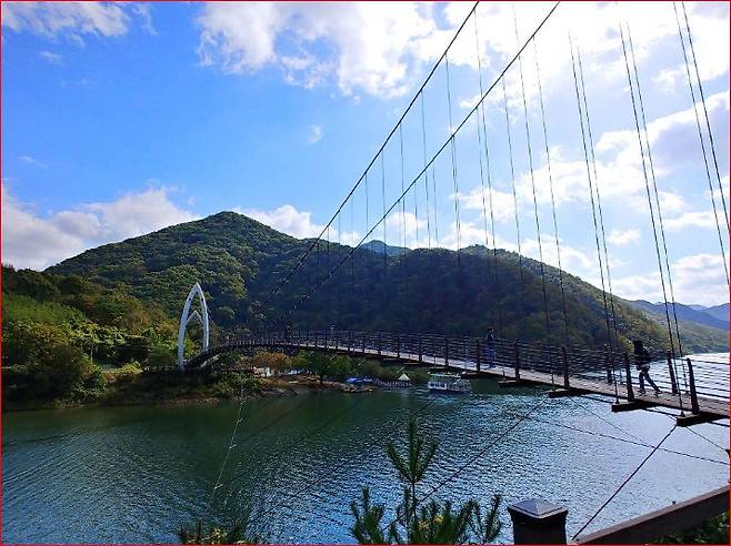 길을 걷다 보면 고인돌 쉼터, 소나무 출렁다리, 한반도전망대, 천장봉 등 산과 호수가 한눈에 들어오는 포인트가 곳곳에 숨어 있어