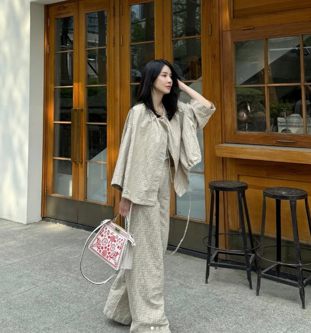 첫번째 사진속 이보영은 베이지 톤의 셋업으로 절제된 고급스러움을 표현했어요. 루즈한실루엣의 상의와 넉넉한 와이드 팬츠가 자연스럽게 흐르며 몸음 감싸고, 전체적인 톤온톤 매치가 그녀의 우아한 이미지와 찰떡같이 어우러집니다. 여기에 레드 포인트가 들어간 자수 토트백으로 은근한 포인트를 준 센스도 돋보이죠.
