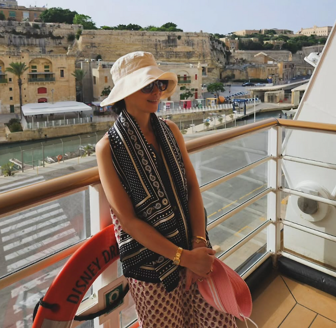 세번째 사진에서 이보영은 플라워 패턴 슬리브리스 점프수트에 버킷햇, 그리고 핑크 샤넬백을 매치해 여름 리조트 룩을 완성했습니다. 컬러풀한 패턴이 주는 발랄함과 자연광 속에서의 여유로운 포즈가 조화를 이루며 여행지 특유의 낭만을 잘 담아낸 스타일이에요.