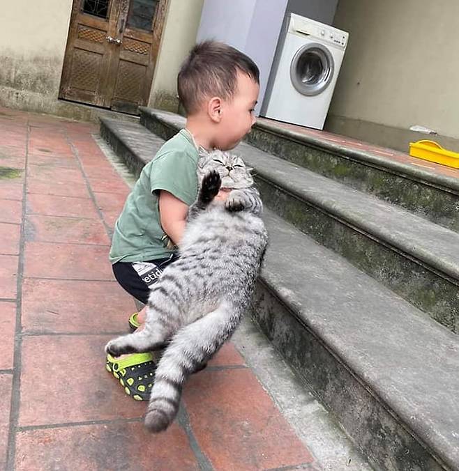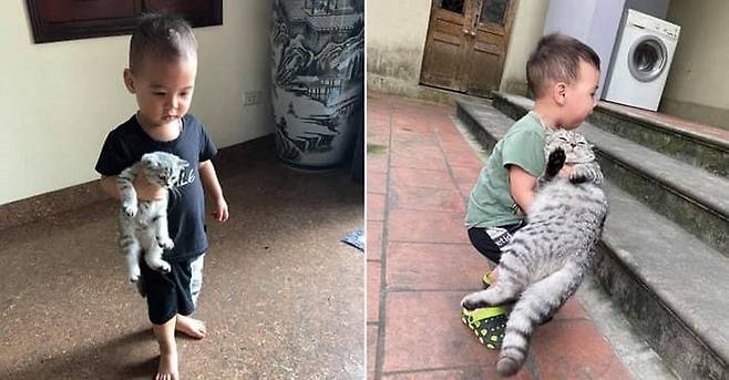 사진 속 꼬마 집사는 훌쩍 커버린 고양이의 무게를 견디지 못해 다리를 굽히고 안간힘을 쓰고 있어, 그사이 고양이의 몸무게가 얼마나 늘어났는지를 짐작게 합니다.