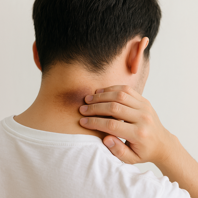 목 뒤나 겨드랑이, 사타구니처럼 접히는 부위에 검붉은 색깔의 두꺼운 피부(흑색극세포증)가 생길 수 있습니다. 이는 인슐린 저항성과 관련된 당뇨 전 단계에서 자주 보이는 변화예요.