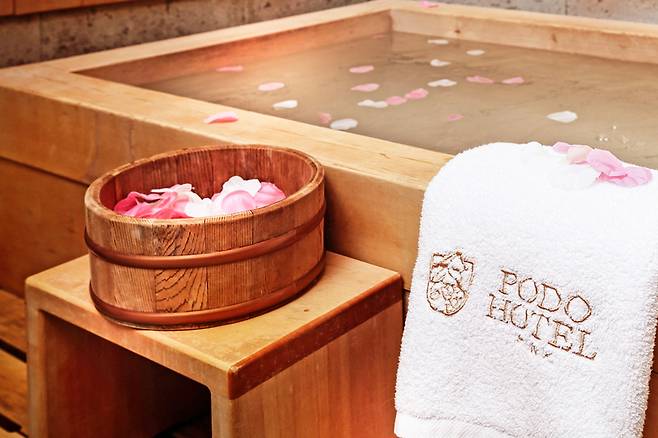 포도 호텔의 또 다른 매력은 온천입니다. 전 객실에서 제공되는 아라고나이트 심층 고온천은 제주도에서는 드물게 발견된 고온천으로, 모든 객실에서 프라이빗하게 이용할 수 있습니다. 양실과 한실 모두 각각 대리석 욕조와 300년 된 편백나무로 만들어진 기소 히노키 욕조를 갖추고 있습니다.