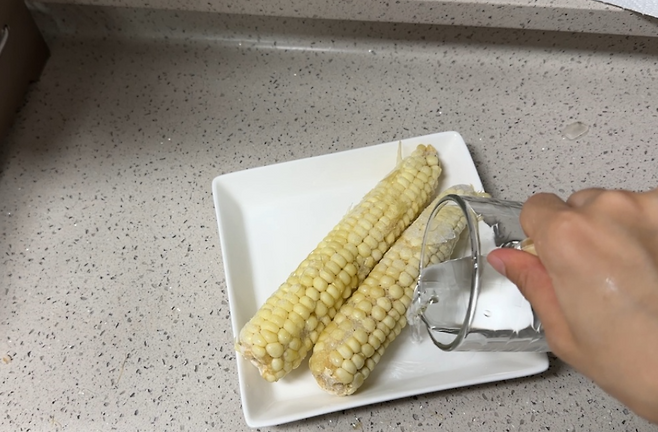 전자레인지 사용이 가능한 접시에 물 50ML 정도 옥수수에 부어주세요.