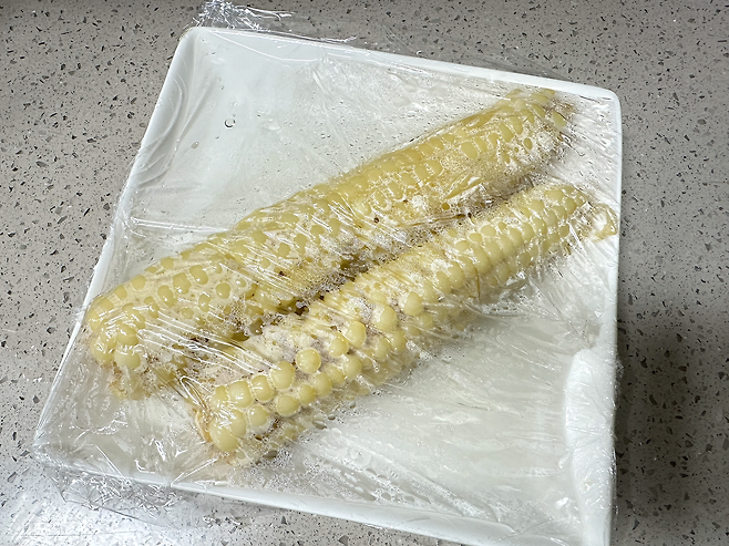 전자레인지로 잘 못 해동하면 수분이 증발해서 옥수수가 딱딱해지는데 이렇게 물과 랩을 이용하니 촉촉하고 맛있게 해동이 가능하더라고요
