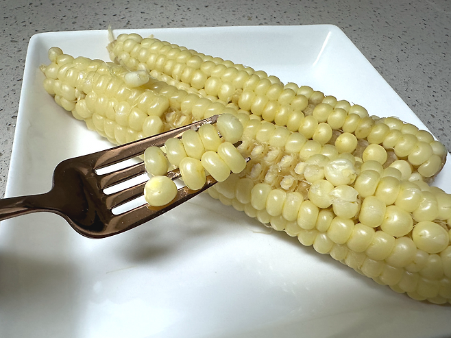 혹시 옥수수 알을 쉽게 드시고 싶으시다면 포크를 이용해서 떠드시면 이를 사용하지 않아도 되니 참고하세요!