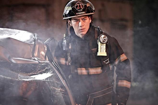 -극중 공사장 옥상에서 자살 시도를 하려는 취객을 강일(고수)이 몸을 날려 추락시켜 구하는 장면.