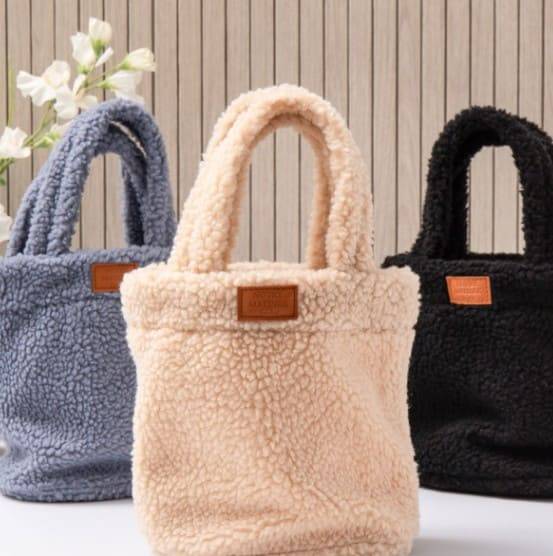 겨울 하면 뽀글이 소재죠. 미니 뽀글이 토트백은 뽀글이 소재로 만들어져서 사랑스럽고 따뜻한 느낌을 주는데 제격인데요. 바닥이 동그랗게 모양 잡혀 있어 물건 담기도 안정적이고, 은근히 많이 들어가는 수납력을 자랑하고 있답니다. 블랙, 블루, 베이지 컬러로 나와 있으니 취향에 맞게 골라보세요. 귀여운 단지형 모양이라 어디에나 들고 다니기도 딱 좋아요.